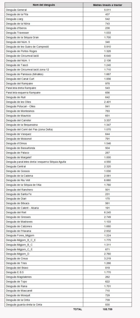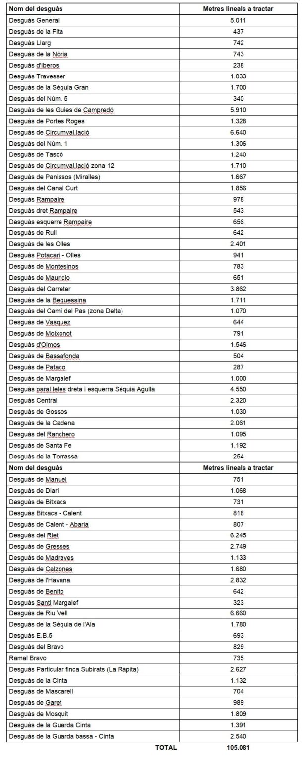 Les prospeccions realitzades durant tota la campanya de reg, ens ajuden a elaborar al final d’aquesta, un plànol amb els trams de desguassos envaïts i que poden ser susceptibles de tractar-se amb aigua de mar. Molts d’aquests desguassos no seran tractats amb aigua de mar en la seva totalitat. Els desguassos susceptibles de ser tractats amb aigua de mar, previ autorització per part del DACC, seran els següents: