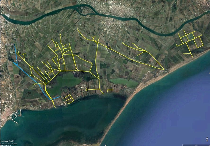 Les prospeccions realitzades durant tota la campanya de reg, ens ajuden a elaborar al final d’aquesta, un plànol amb els trams de desaigüe envaïts i que poden ser susceptibles de tractar-se amb aigua de mar. Molts d’aquests desaigües no seran tractats amb aigua de mar en la seva totalitat. Els desaigües susceptibles de ser tractats amb aigua de mar, previ autorització per part del DACC, seran els següents: